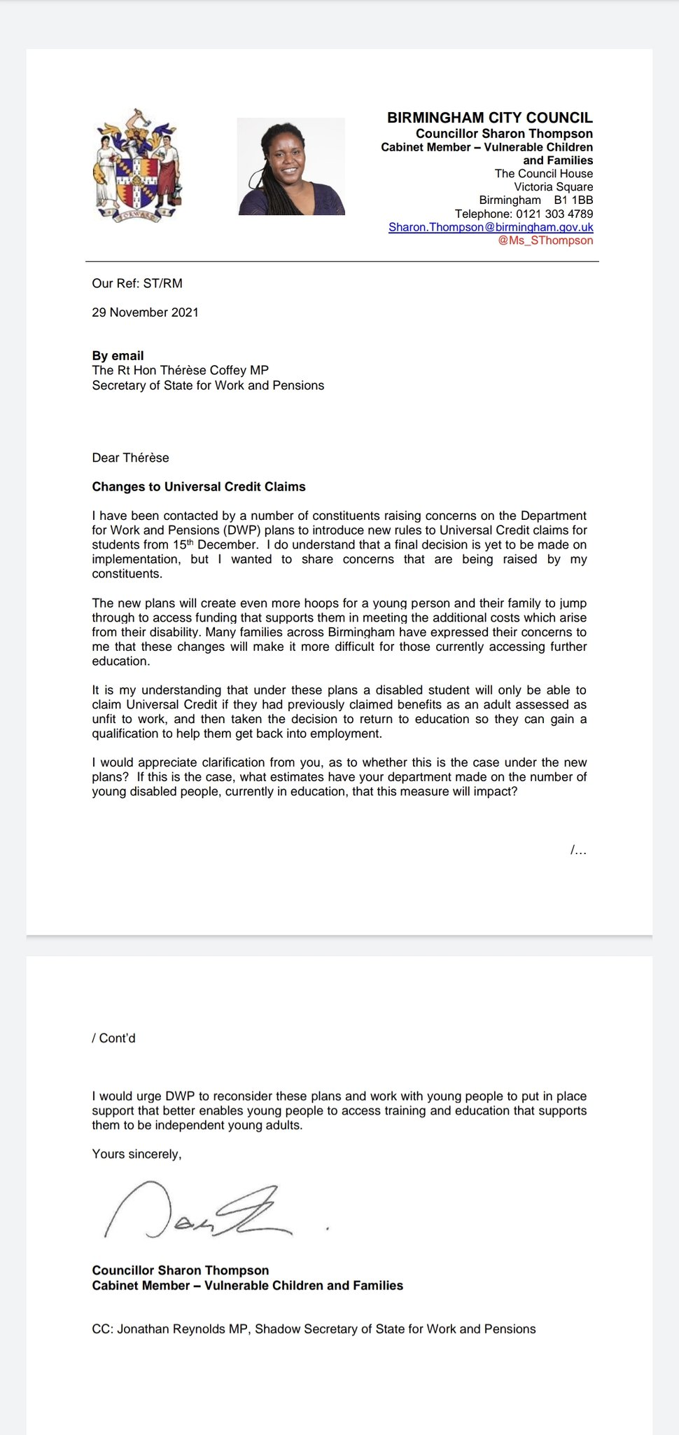 Cllr Sharon Thompson has written to the Department for Work and Pensions Secretary, Therese Coffey MP, to raise concerns on behalf of thousands of families across Birmingham, about the Government's plans to cut Universal Credit support for disabled young people. Under current plans a disabled student will only be able to claim Universal Credit if they have previously claimed support as an adult classed as unfit to work and then taken the decision to return to education to gain a qualification, making it even harder for hundreds of families across Birmingham to claim support.
